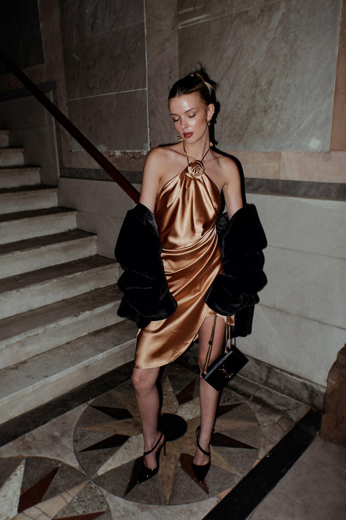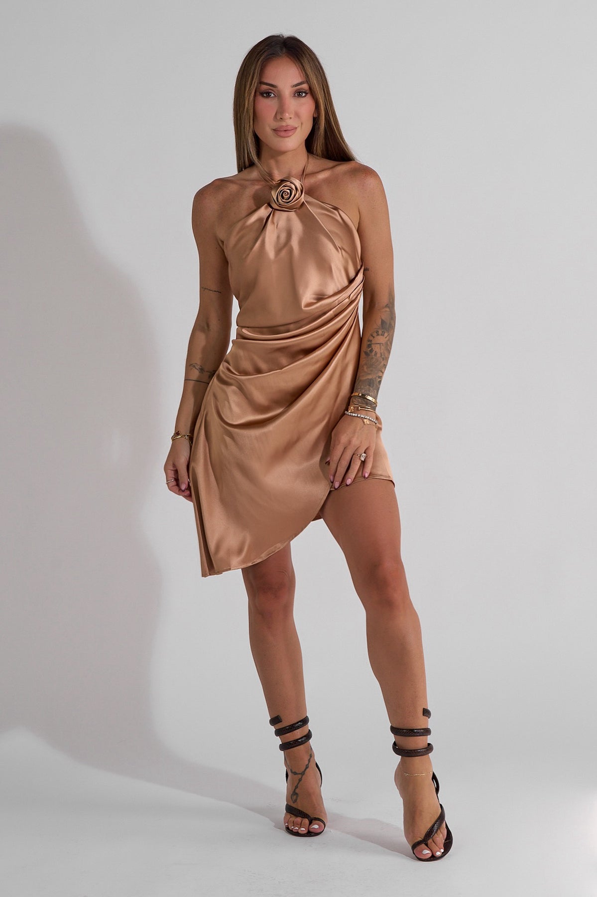 Sophisticated and elegant halter-neck dress featuring a unique twisted rosette at the neckline