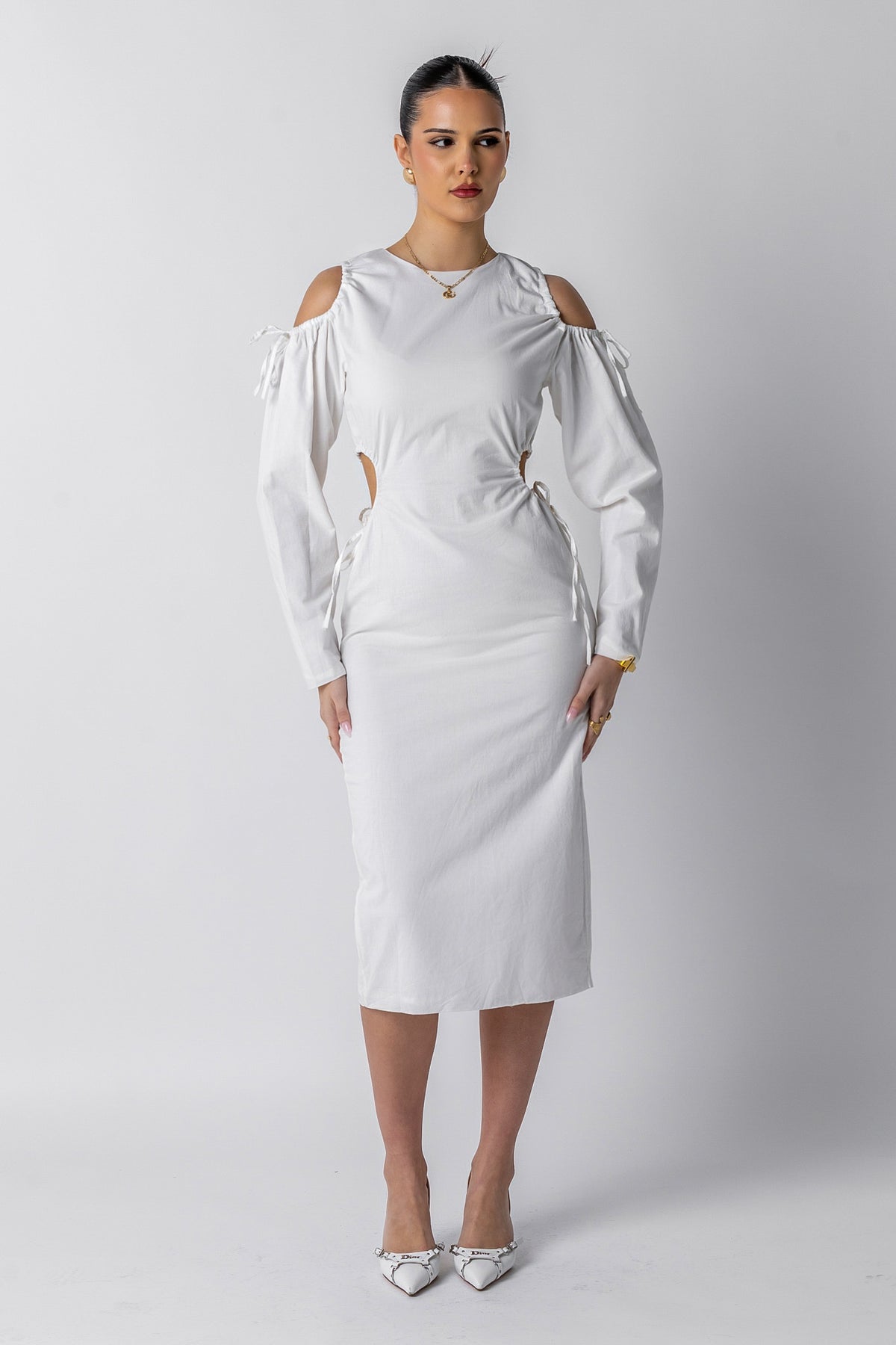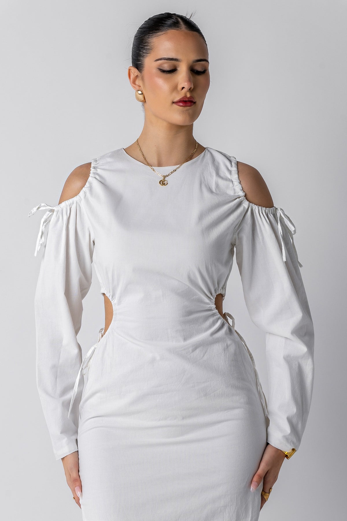 Cold-shoulder design with cut-out sides and drawstring detailing on both sides. Invisible back zipper.
