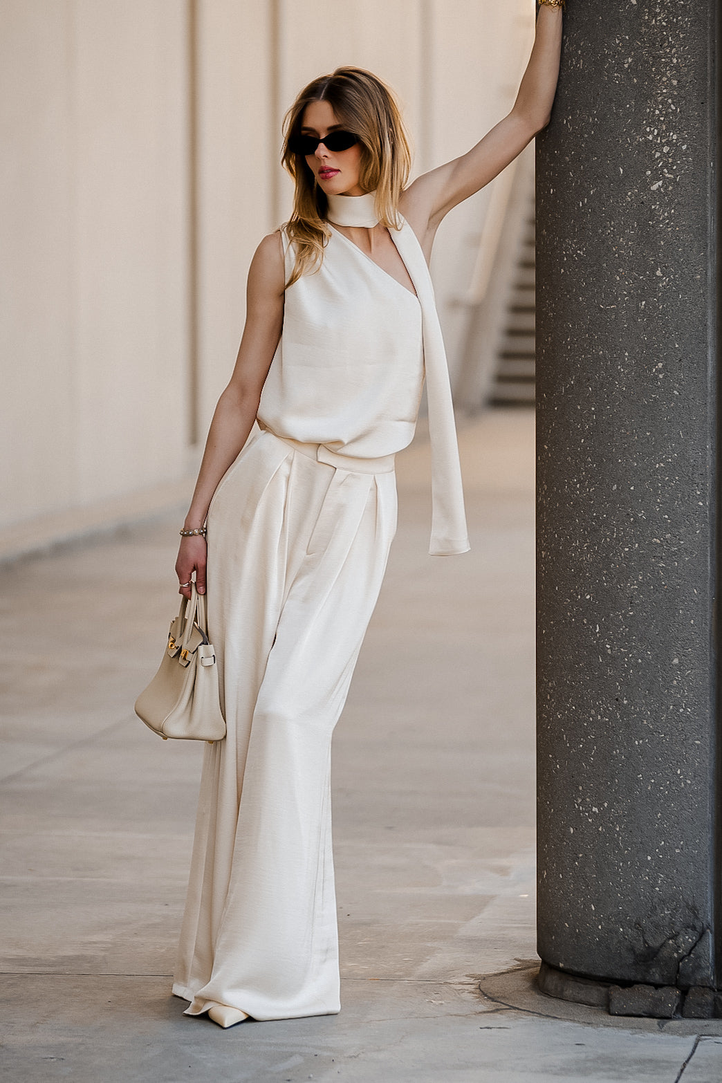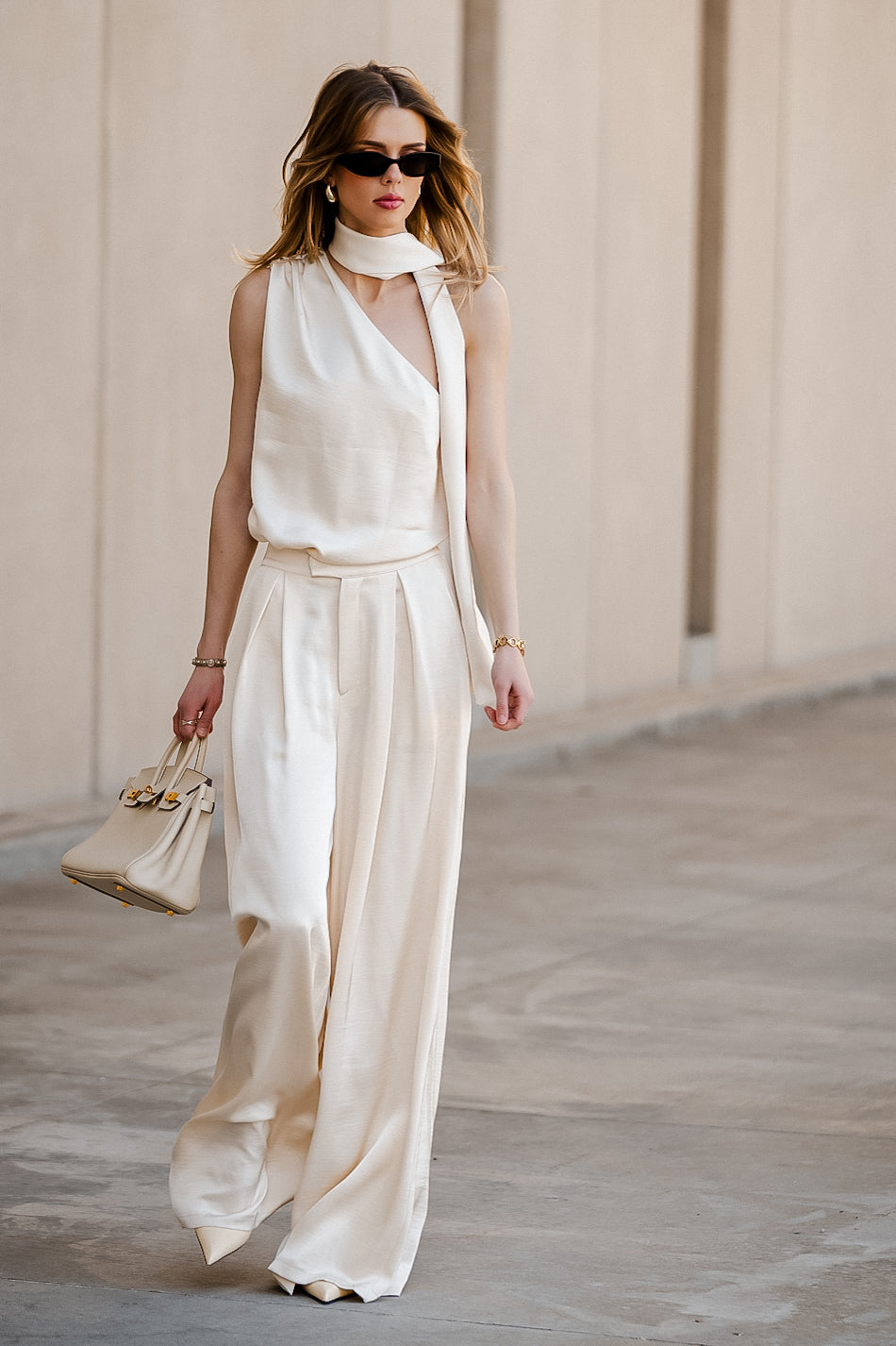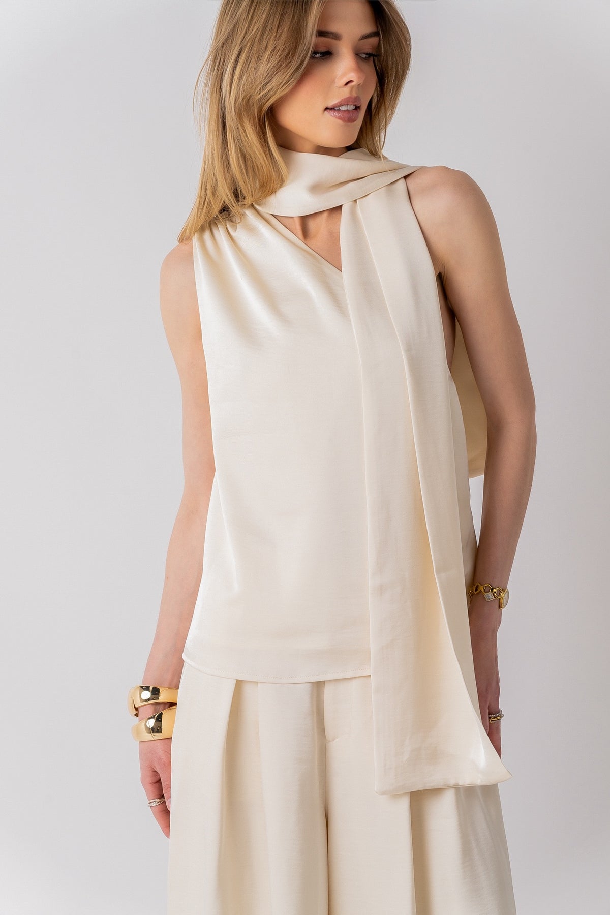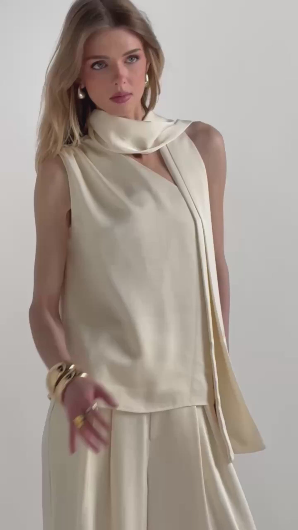 Sophisticated sleeveless top with a modern asymmetric, draped design that transitions seamlessly from day to evening wear.